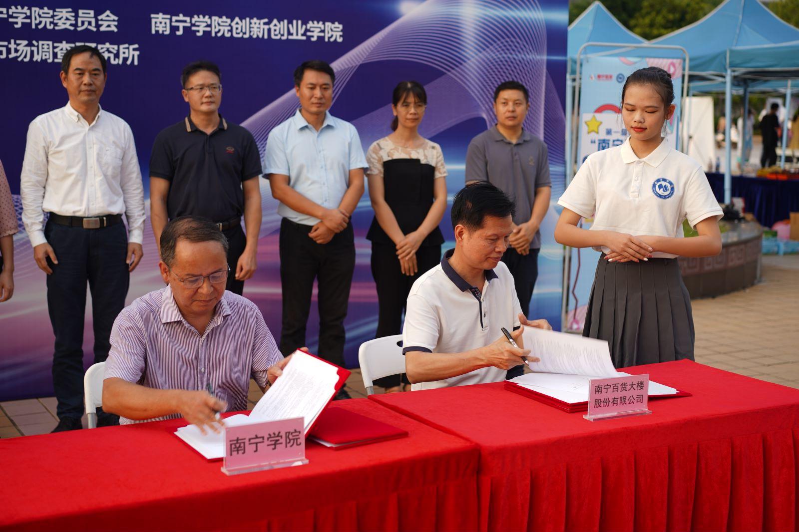 经过近3个多月的紧张筹备,南宁学院第一届南宁学院校园生活节暨“南宁百货杯”营销大赛开幕仪式及校企合作签约仪式于2022年9月22日下午,在南宁学院体育馆前广场隆重举行。南宁百货大楼股份有限公司总经理覃耀杯,南宁百货大楼股份有限公司党委副书记胡盛品,南宁百货大楼股份有限公司新零售运营中心总经理李春阳,南宁学院校长李栋学,南宁学院副校长陈雄章,南宁学院创新创业学院院长马骏,南宁学院商学院党委书记吴忠,南宁学院商学院副书记田爽,南宁学院商学院副院长蒋丽君等嘉宾共同出席了本次活动。
