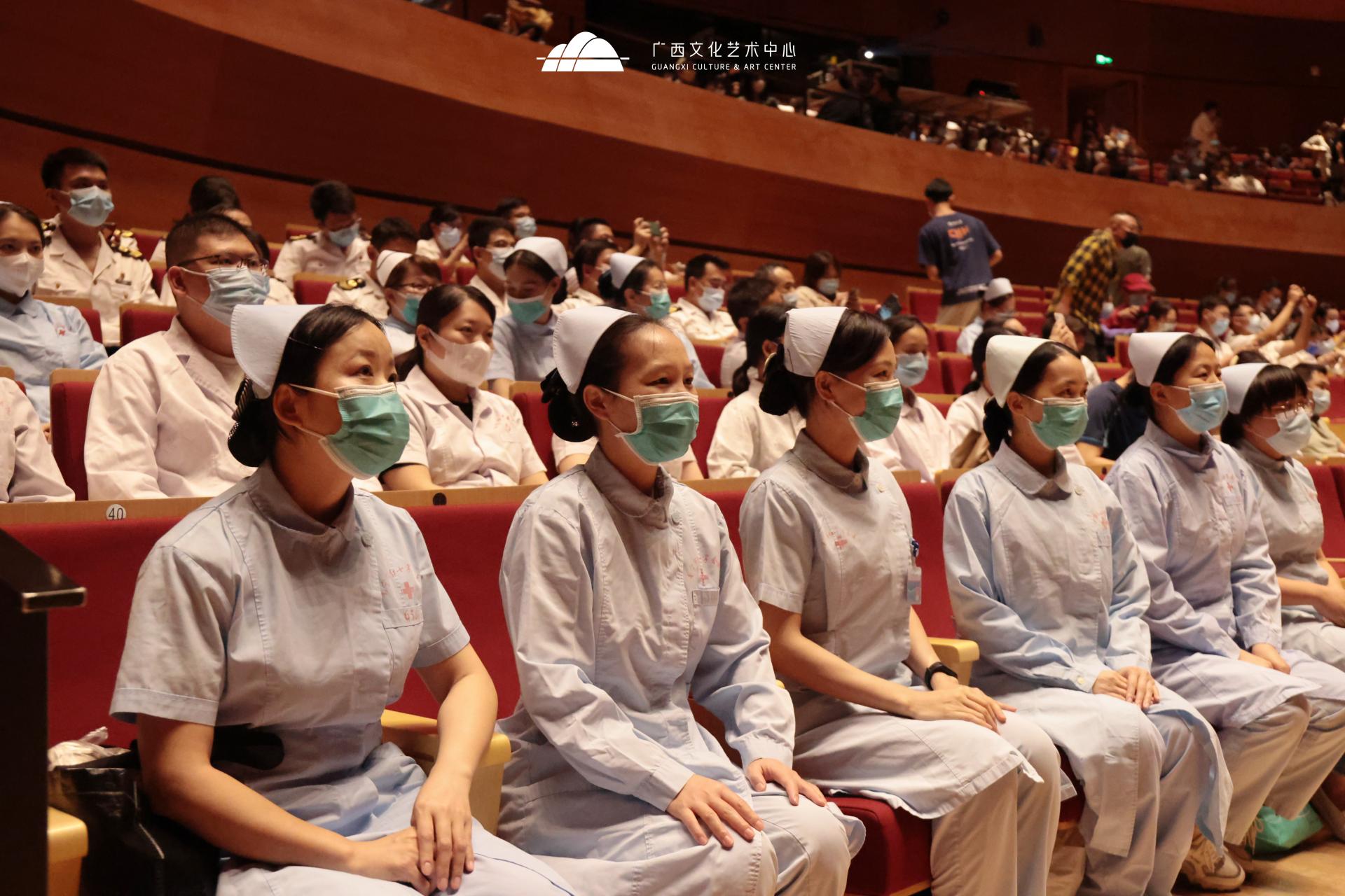 为充分发挥文艺“暖心”、文艺“聚力”的重要作用,实现疫情当下“致敬英雄”,以实际行动推动演艺市场复苏,今年,广西文化艺术中心联合南宁市卫健委,特别邀请近500名医护人员相聚剧场观看大型民族舞剧《醒·狮》。这是广西文化艺术中心自疫情发生以来连续第三年邀请抗疫一线医护人员观演,向我市奋战在疫情一线的“最美逆行者”致敬。