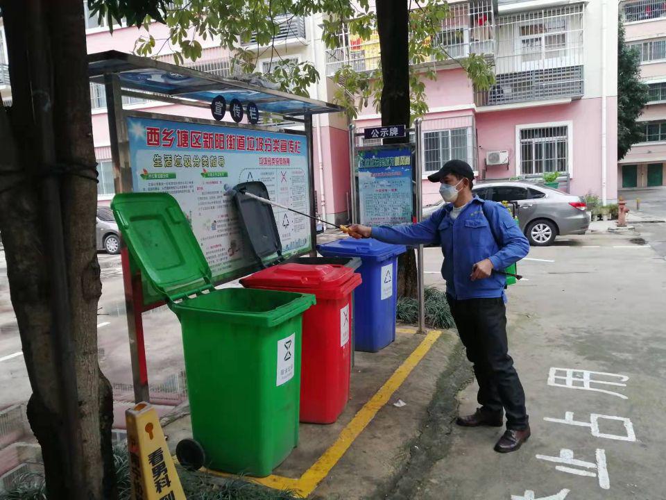 保洁人员对新阳造纸厂生活区分类垃圾桶进行消杀