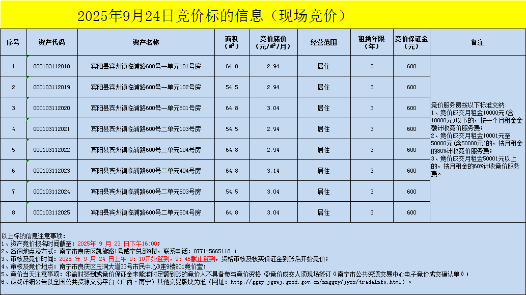2025年9月24日竞价标的信息(现场竞价)