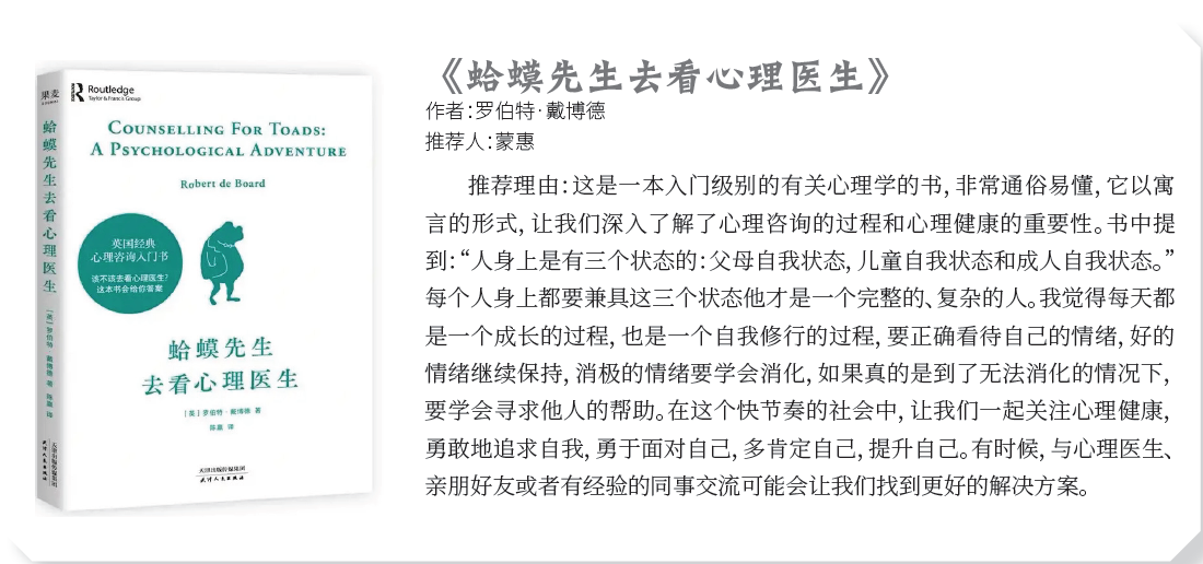 作者:罗伯特·戴博德 推荐人:蒙惠 推荐理由:这是一本入门级别的有关心理学的书,非常通俗易懂,它以寓 言的形式,让我们深入了解了心理咨询的过程和心理健康的重要性。书中提 到:“人身上是有三个状态的:父母自我状态,儿童自我状态和成人自我状态。” 每个人身上都要兼具这三个状态他才是一个完整的、复杂的人。我觉得每天都 是一个成长的过程,也是一个自我修行的过程,要正确看待自己的情绪,好的 情绪继续保持,消极的情绪要学会消化,如果真的是到了无法消化的情况下, 要学会寻求他人的帮助。在这个快节奏的社会中,让我们一起关注心理健康, 勇敢地追求自我,勇于面对自己,多肯定自己,提升自己。有时候,与心理医生、 亲朋好友或者有经验的同事交流可能会让我们找到更好的解决方案。