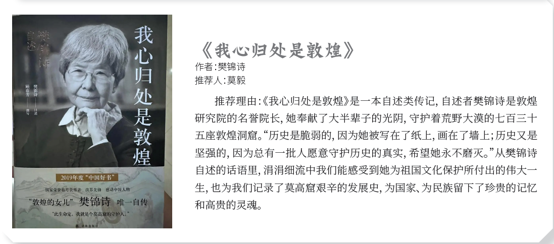 作者:樊锦诗 推荐人:莫毅 推荐理由:《我心归处是敦煌》是一本自述类传记,自述者樊锦诗是敦煌 研究院的名誉院长,她奉献了大半辈子的光阴,守护着荒野大漠的七百三十 五座敦煌洞窟。“历史是脆弱的,因为她被写在了纸上,画在了墙上;历史又是 坚强的,因为总有一批人愿意守护历史的真实,希望她永不磨灭。”从樊锦诗 自述的话语里,涓涓细流中我们能感受到她为祖国文化保护所付出的伟大一 生,也为我们记录了莫高窟艰辛的发展史,为国家、为民族留下了珍贵的记忆 和高贵的灵魂。