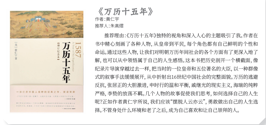 作者:黄仁宇 推荐人:朱高熠 推荐理由:《万历十五年》独特的视角和深入人心的主题吸引了我。作者在 书中精心刻画了各种人物,从皇帝到平民,每个角色都有自己鲜明的个性和 命运。通过这些人物,让我们对明朝万历年间社会的各个方面有了更深入地了 解,也可以从中领悟属于自己的人生感悟。这本书把历史剖开一个横截面,像 纪录片导演穿越过去一样,把当时的一位皇帝和五位著名的大臣,以一种群像 式的叙事手法缓缓展开,从中折射出16世纪中国社会的完整面貌。万历的逃避 反抗,张居正的大胆激进,申时行的温和平衡,戚继光的现实主义,海瑞的纯粹 严格,李贽的放荡不羁。几个人物的故事促使我们思考,如何选择自己的人生 呢?正如作者黄仁宇所说,我们应该“摆脱人云亦云”,勇敢做出自己的人生选 择。不管身处什么环境和老了之后,成为自己喜欢和让自己崇拜的人。