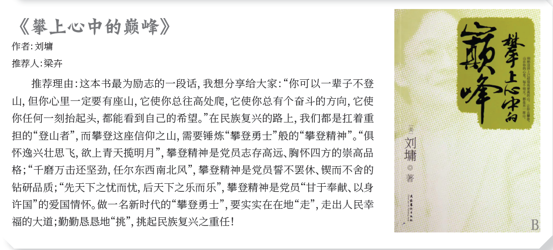 作者:刘墉 推荐人:梁卉 推荐理由:这本书最为励志的一段话,我想分享给大家:“你可以一辈子不登 山,但你心里一定要有座山,它使你总往高处爬,它使你总有个奋斗的方向,它使 你任何一刻抬起头,都能看到自己的希望。”在民族复兴的路上,我们都是扛着重 担的“登山者”,而攀登这座信仰之山,需要锤炼“攀登勇士”般的“攀登精神”。“俱 怀逸兴壮思飞,欲上青天揽明月”,攀登精神是党员志存高远、胸怀四方的崇高品 格;“千磨万击还坚劲,任尔东西南北风”,攀登精神是党员誓不罢休、锲而不舍的 钻研品质;“先天下之忧而忧,后天下之乐而乐”,攀登精神是党员“甘于奉献、以身 许国”的爱国情怀。做一名新时代的“攀登勇士”,要实实在在地“走”,走出人民幸 福的大道;勤勤恳恳地“挑”,挑起民族复兴之重任!