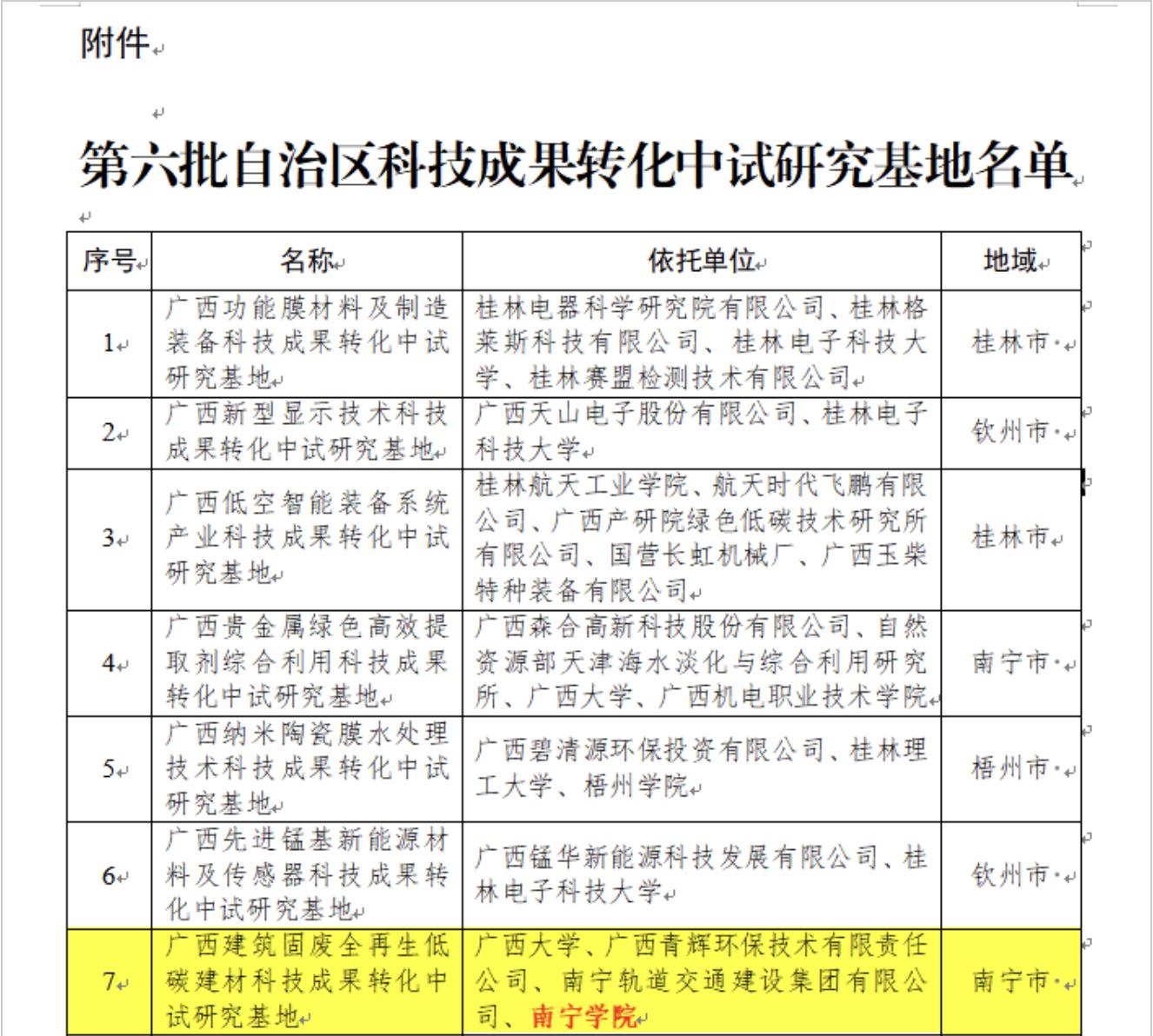 获批名单十月,广西壮族自治区科学技术厅发布《自治区科技厅关于公布第六批自治区科技成果转化中试研究基地名单的通知》(桂科发〔2025〕413号),世界杯在线所属南宁学院携手广西大学、广西青辉环保技术有限责任公司、南宁轨道交通建设集团有限公司联合申报的“广西建筑固废全再生低碳建材科技成果转化中试研究基地”成功获批,这标志着南宁学院在科技成果转化与产学研协同创新领域迈出关键步伐。此次获批的中试研究基地,依...