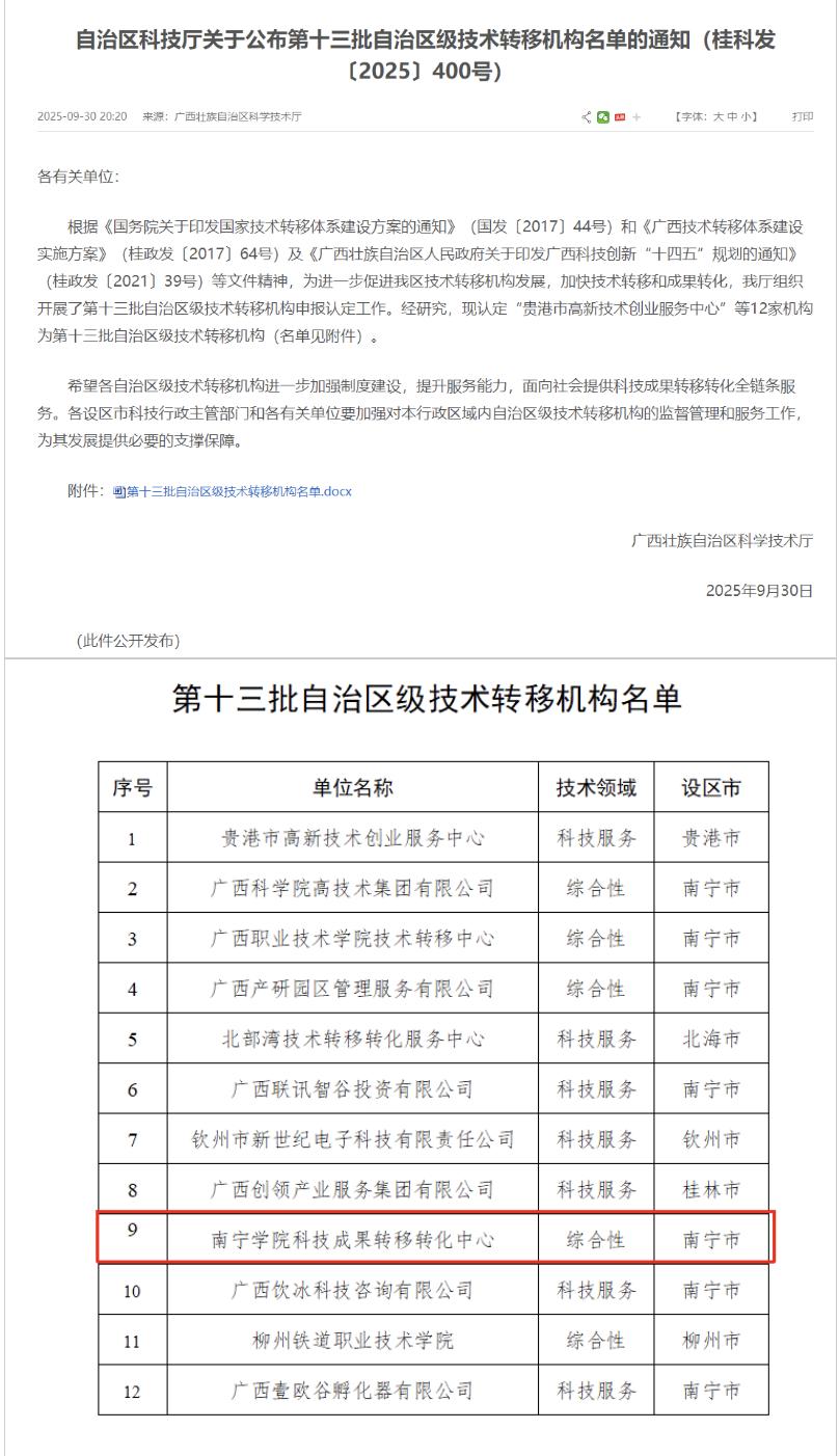 获批机构名单2025年9月30日,根据《自治区科技厅关于公布第十三批自治区级技术转移机构名单的通知》(桂科发〔2025〕400号),南宁学院科技成果转移转化中心被认定为第十三批自治区级技术转移机构。近年来,南宁学院高度重视技术转移转化工作,积极采取一系列有效措施,技术转移转化取得了较好成效,以许可、转让方式转化专利成果300多件,以技术开发、技术服务和技术咨询转化科技成果600多项;南宁学院通过了《高校知识产权管...