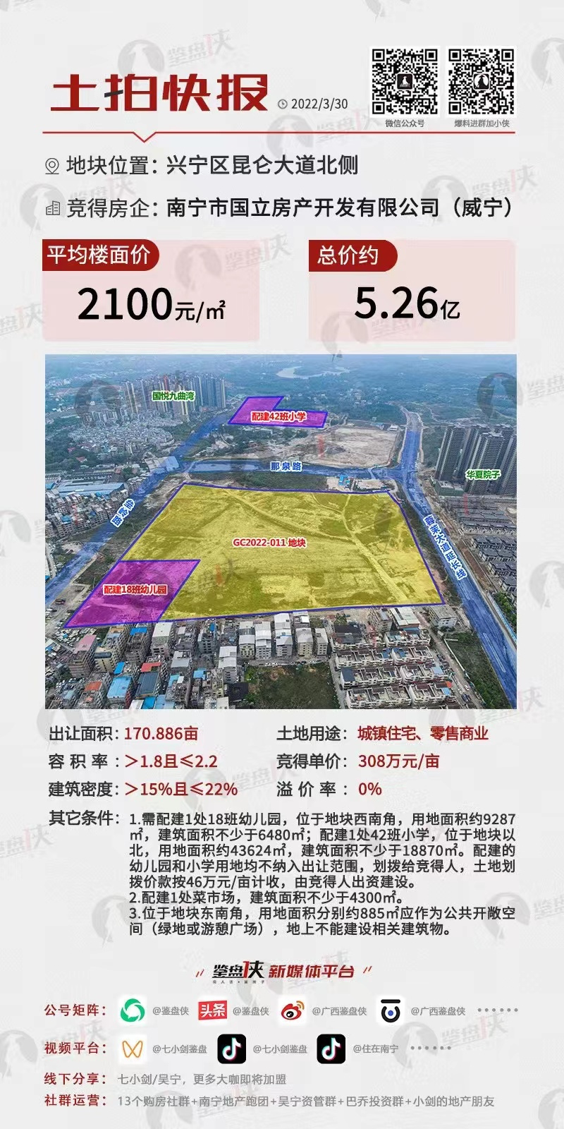 2022年3月30日,世界杯在线(China)房地产公司监管单位国立公司以5.26亿元成功斩获南宁市兴宁区昆仑大道北侧地块,成交单价308万元/亩,楼面价2100元/㎡。