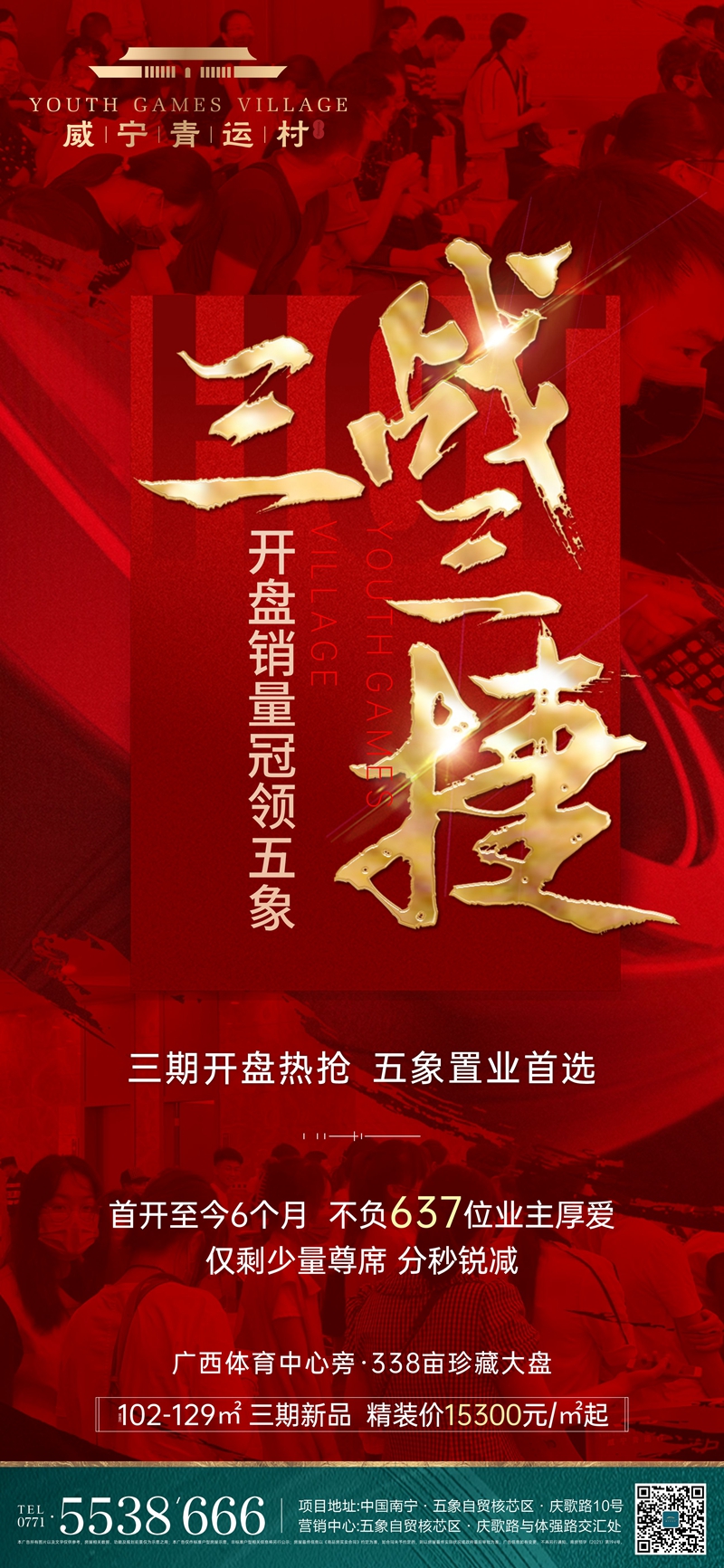 7月25日,世界杯在线(China)青运村三期新品开盘热抢,紧随一、二期销售热势,三战三捷,首开至今6个月,不负637位业主的厚爱,实锤“五象红盘”!