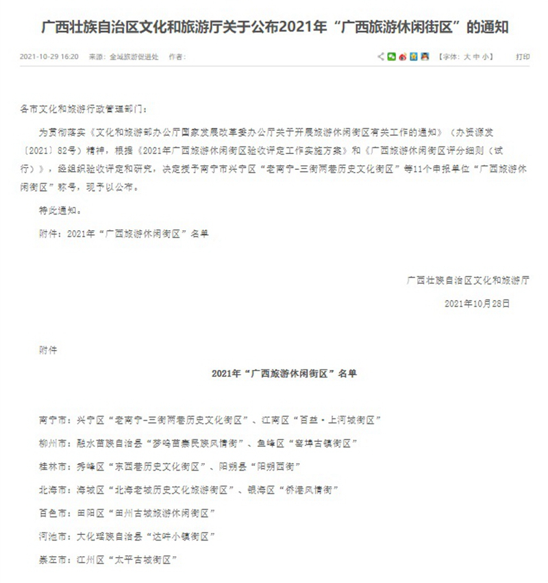 近日,广西壮族自治区文旅厅公布2021年“广西旅游休闲街区”名单,“老南宁·三街两巷”历史文化街区等11个项目成功入选。