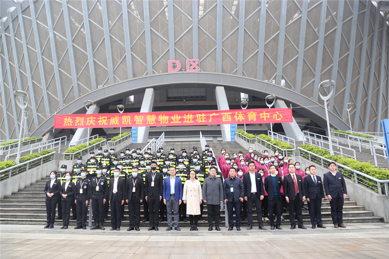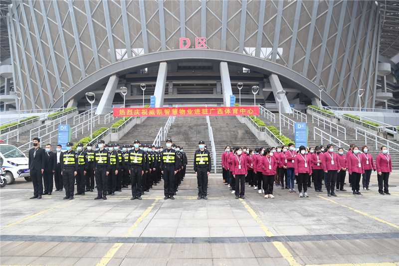 队伍展示2022年1月14日上午,威凯智慧物业正式进驻广西体育中心,从中标到入驻仅用了13天,充分显示了威凯智慧物业承接项目的实力与效率。进驻仪式在体育中心主体育馆D区前广场举行,活动现场,威凯智慧物业公司进行了队伍、设备展示,彰显了威凯物业高标准、高效率、高品质服务。广西体育中心总占地2000亩,总建筑面积达50.8万平方米。配套包括主体育场、体育馆、游泳跳水馆以及现代化的网球中心。威凯智慧物业